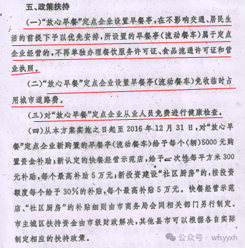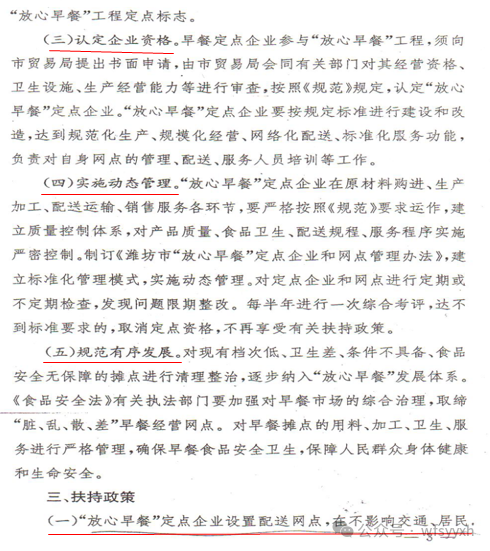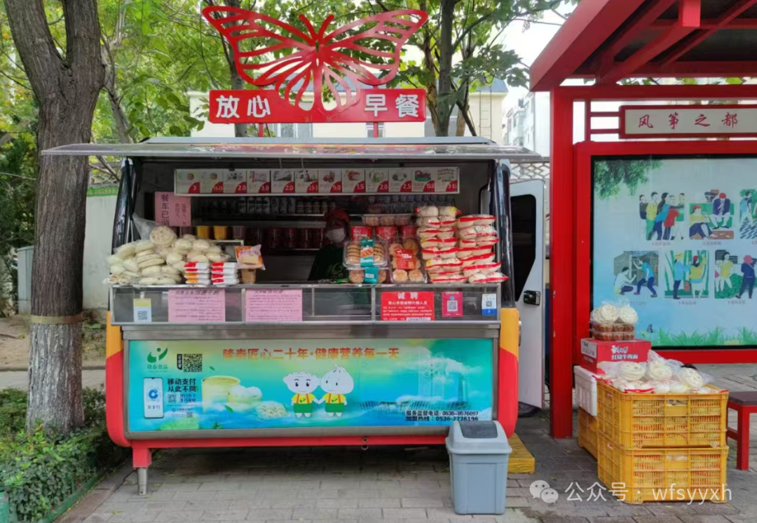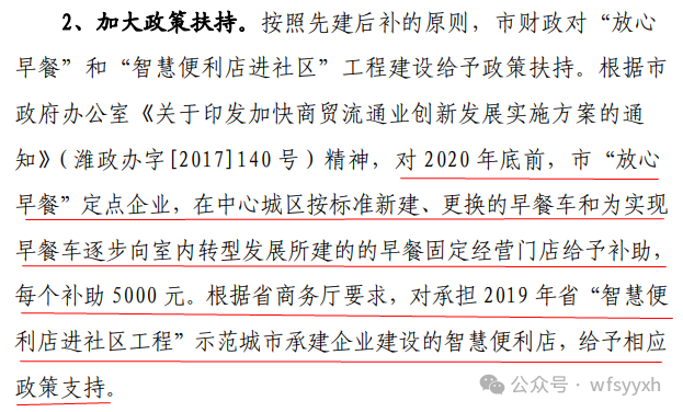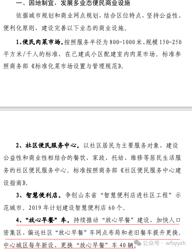 →→→ 2019年,潍坊市商务局印发《关于加快社区便民商业设施建设的实施意见》。《意见》中指出,为贯彻落实中央关于促进形成强大国内市场指示精神,深入推进全市商贸流通业新旧动能转换,推动利用闲置场所新建便民商业设施,对现有商业设施进行升级改造,就加快推进我市社区便民商业设施建设提出实施意见。其中,在“因地制宜,发展多业态便民商业设施”方面,明确提出:据城市规划和商业网点规划,结合区位特点,坚持公益性、便利化原则,建设完善以下业态的商业设施。……4、“放心早餐”车。持续推动“放心早餐”建设,加快人口密集区、偏远社区“放心早餐”车网点布局和老旧餐车提升更换。中心城区每年新设、更换“放心早餐”车 40 辆……;在“加强现有商业设施提升改造”方面,明确提出:……三是提高“放心早餐”质量,逐步推进“放心早餐”由亭向店发展,加快“隆泰麦和祥 1+1 简餐超市”连锁店建设步伐……在“落实责任,加大政策支持”方面,明确提出:……2、加大政策扶持。按照先建后补的原则,市财政对“放心早餐”和“智慧便利店进社区”工程建设给予政策扶持。根据市政府办公室《关于印发加快商贸流通业创新发展实施方案的通知》(潍政办字[2017]140 号)精神,对 2020 年底前,市“放心早餐”定点企业,在中心城区按标准新建、更换的早餐车和为实现早餐车逐步向室内转型发展所建的的早餐固定经营门店给予补助,每个补助 5000 元。
