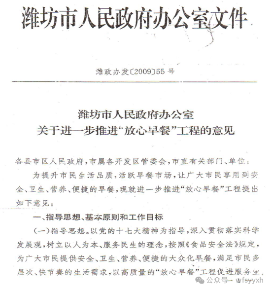 →→→ 2009年7月,潍坊响应商务部“积极承担社会责任,努力开办早餐服务”的倡议,在城区重启“放心早餐”工程,并计划利用3年时间,在市区发展350个“放心早餐”网点。这次,潍百集团中百连锁超市、潍坊瀚升食品有限公司、山东潍坊丰香园饮食服务有限公司、潍坊正荣食品有限公司和潍坊隆泰绿丰食品有限公司5家早餐经营企业参与了“放心早餐”的供应和销售。第一辆放心早餐车也于此时上线。