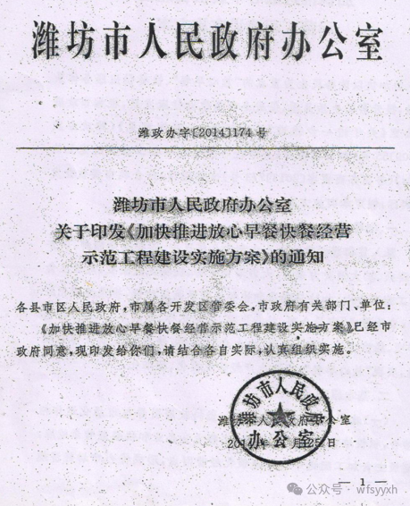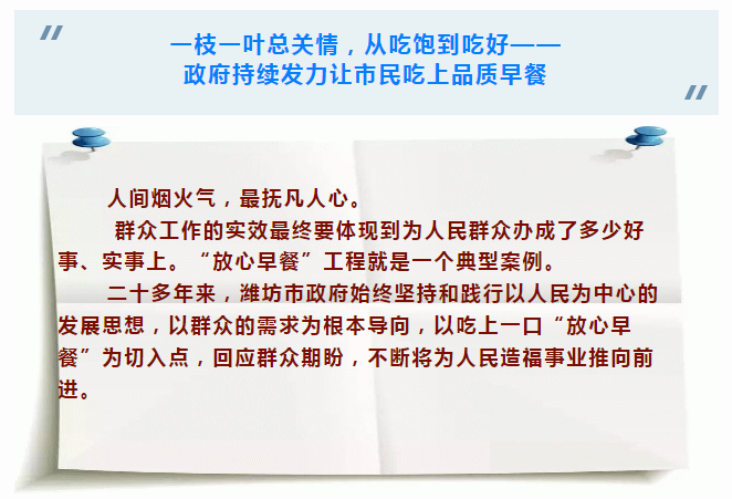 →→→ 2014年,潍坊出台《加快推进放心早餐快餐经营示范工程建设实施方案》。方案提出,到2015年底,市主城区完成主食加工配送中心1处,新建早餐亭150个,培育快餐经营示范店60个,建设“社区厨房”6个;2016年新建早餐亭75个,培育早餐示范店40个,建设“社区厨房”4个。到2016年底,全市早餐主食加工配送中心达到5个,建设早餐销售网点1000个,创建快餐经营示范店200个。其中,市主城区建设早餐亭500个,快餐经营示范店100个,“社区厨房”10个;各县市早餐、快餐社区经营网点覆盖率达到80%,并延伸到各街道、镇政府驻地;市主城区社区经营网点覆盖率要达到95%,形成完善的早餐、快餐供应服务体系;实现标准化生产、统一加工配送、连锁经营、服务规范的早餐、快餐供应服务网络。