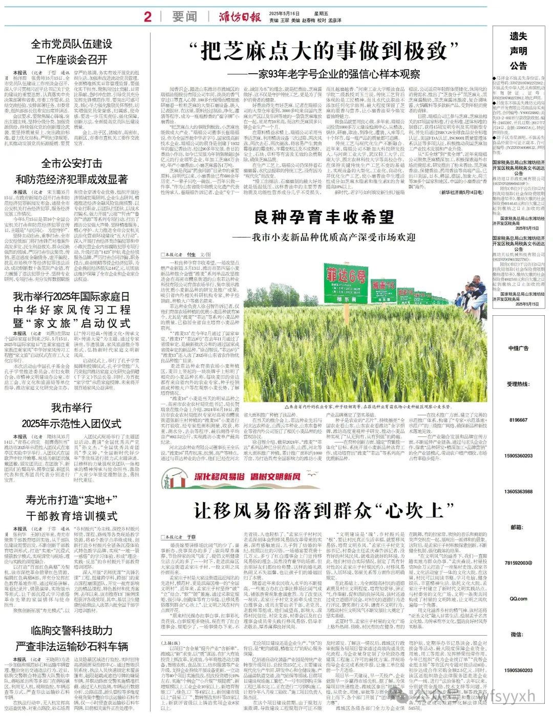 2025年5月14日,新华社记者杨守勇、王志以《“把芝麻点大的事做到极致”——一家93年老字号企业的强信心样本观察》为题,对潍坊市营养协会会员企业瑞福油脂股份有限公司做了典型报道。新华社的宣传报道,让世界了解了瑞福油脂,进一步扩大了瑞福油脂的品牌影响力。文中特别指出:“一辈子只吃一碗饭,一百年只做一件事。”作为山东省级非物质文化遗产代表性传承人,崔瑞福告诉记者,企业“专于一业、诚信为本”的理念,就是把香油、芝麻酱做好。这不