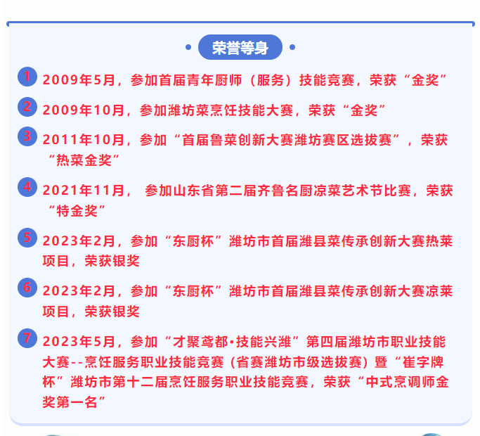 2009年5月,邱全岗荣获“首届青年厨师(服务)技能竞赛金奖”;2014年8月被中国饭店协会授予“中国烹饪大师”荣誉称号;2021年10月荣获“齐鲁烹饪工匠”金鼎奖;2023年5月荣获“才聚鸢都·技能兴潍”第四届潍坊市职业技能大赛“中式烹调师金奖第一名”;2023年12月被奎文区总工会授予“奎文工匠”荣誉称号。他是省烹饪协会“名厨委员会委员”、2022年度“齐鲁厨艺大工匠——新时代最美厨师长”“齐鲁名厨”“中国鲁菜烹饪名师”“潍坊市技术能手”。